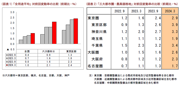・「全国」の地価動向は、全用途平均(商業地・住宅地・工業地の平均、以下同じ。)で前期比(2023年9 月末比、以下同じ。)1.0%(前回0.8%)、前期に続き上昇となった(図表1 参照)。