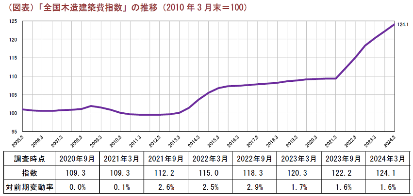 ・全国の木造建築費指数は、2010 年3 月末を100 として124.1 となった。