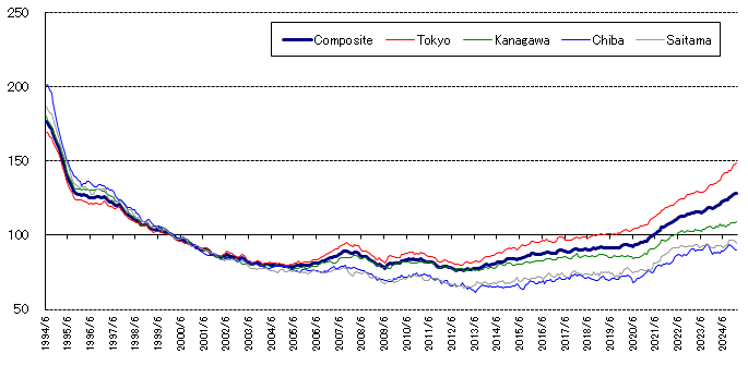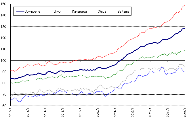 不動研住宅価格指数のうち首都圏総合は128.50ポイント(前月比0.23%)で13ヶ月連続上昇、地域別では、東京が149.09ポイント(前月比0.52%)で5ヶ月連続上昇、神奈川108.83ポイント(前月比0.25%)で2ヶ月連続上昇、千葉89.69ポイント(前月比-0.76%)で4ヶ月連続下落、埼玉94.48ポイント(前月比-1.20%)で4ヶ月連続下落しました。